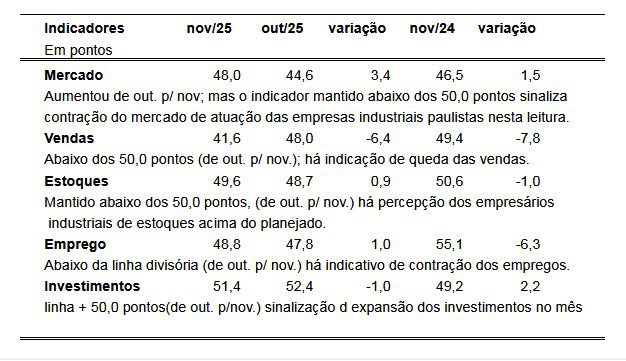 A atividade da indústria de São Paulo fecha o mês de novembro em queda, segundo a pesquisa Sensor da Federação das Indústrias de São Paulo (Fiesp). O Sensor apurou a marca de 47,8 pontos ou redução de 0,3 ponto em comparação ao de outubro anterior e encolheu 1,9 ponto sobre o mês de novembro de 2024.