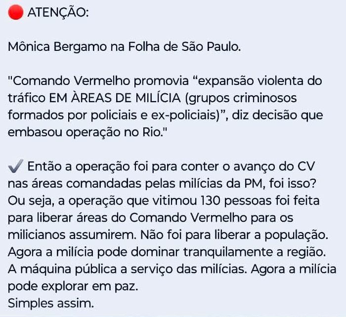 O que fizeram no Rio foi para agravar o caos e açular os EUA a intervirem no Brasil. A chacina foi uma senha para votar o projeto defendido pelos americanos para toda a América do sul. O presidente da Câmara, Hugo Motta (Republicanos-PB), já indicou que pretende levar o texto a voto na segunda semana de novembro. O atual secretário de Segurança Pública de São Paulo, Guilherme Derrite (PP-SP), um notório defensor de chacinas, deverá reassumir o mandato na semana que vem para relatar a proposta.