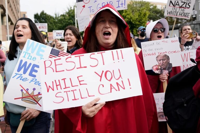 Leah Greenberg, também da Indivisible, criticou a ação de Trump enviando a Guarda Nacional para cidades por todo o país, reprimindo imigrantes indocumentados e processando oponentes políticos.