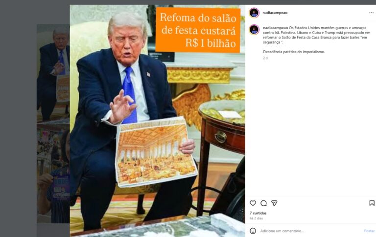 “Os Estados Unidos mantêm guerras e ameaças contra Irã, Palestina, Líbano e Cuba e Donald Trump está preocupado em reformar o Salão de Festa da Casa Branca para fazer bailes ‘em segurança’, criticou Nádia Campeão. Para ela, esse comportamento revela como “é patética a decadência do imperialismo”.