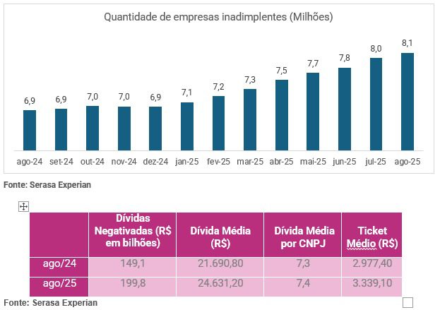 O número representa um salto de 17% em relação a agosto de 2024, quando havia 6,9 milhões de CNPJs negativados. No mesmo período, a dívida média das empresas aumentou 13,6%, passando de R$ 21.690,80 para R$ 24.631,20.