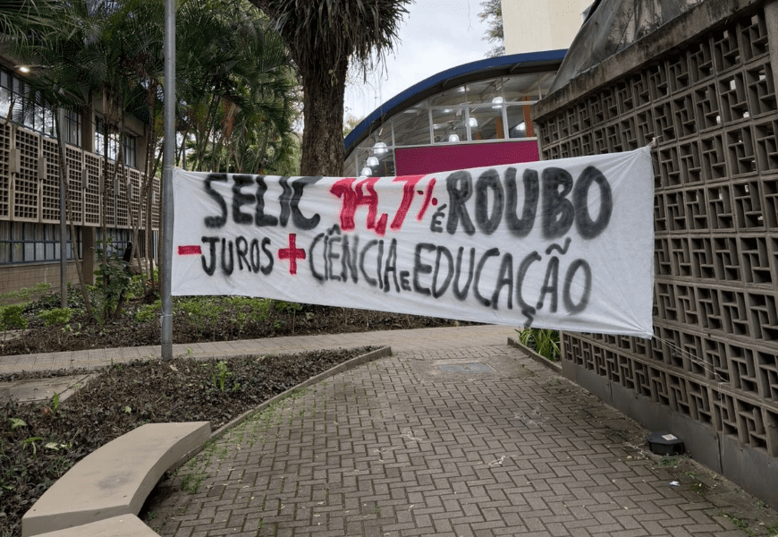 O grupo estendeu uma faixa no caminho por onde Galípolo passaria com os dizeres “Selic 14,7% é roubo – juros + ciência + educação”. Galípolo, alvo do protesto, evitou entrar pela portaria principal da faculdade e entrou pelo estacionamento.