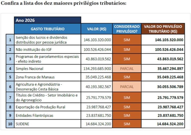 A isenção do Imposto sobre a Renda (IR) na distribuição de lucros e dividendos por empresas, principal isenção fiscal, é igual aos R$ 146,1 bilhões. Este valor já considera taxação de até 10% sobre rendimentos a partir de R$ 600 mil por ano, introduzida pela Lei 15.270/25, a partir do ano que vem.