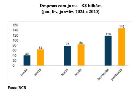 O total dispendido com juros no segundo mês do ano foi 7% mais elevado do que o realizado em fevereiro do ano passado, que havia registrado R$ 78 bi. Para 2026, trata-se do maior volume de tal rubrica para esse período do ano. Caso seja considerado o primeiro bimestre, somando os dois primeiros meses do ano, a diferença ainda é maior: no atual exercício foram R$ 148 bi, representando um crescimento de 25% sobre os R$ 119 bi observados em 2025. Essa escalada no crescimento do cumprimento das obrigações financeiras do endividamento público já vinha sendo apontada como uma tendência desde bem antes.