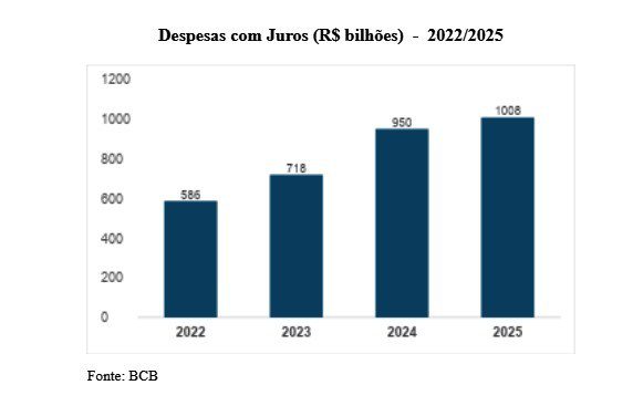 Esse movimento pode ser confirmado pelo acompanhamento dos últimos anos, quando o crescimento dos encargos dos títulos de endividamento do Tesouro Nacional tem sido bastante evidente. O gráfico abaixo exibe os valores anuais crescentes desde 2022 e o patamar trilionário atingido em 2025.