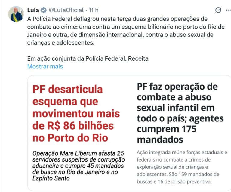 “Já na operação em defesa de crianças e adolescentes, mais de 500 policiais federais atuam em todos os estados e em articulação com forças de segurança estaduais e de outros 15 países”, afirmou Lula. “São 159 mandados de busca e apreensão e 16 de prisão preventiva, com foco na identificação e prisão de autores de crimes de abuso sexual, muitos deles potencializados pelo ambiente digital. Só em 2026, a Polícia Federal já cumpriu mais de 450 mandados de prisão contra foragidos por crimes sexuais”, postou o presidente.