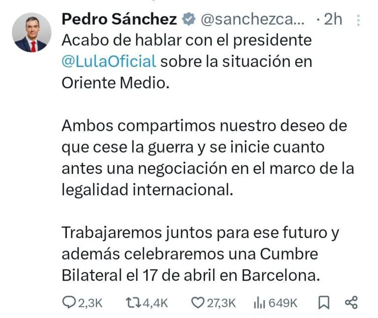 Em resposta, Sánchez fez um pronunciamento reiterando que a posição da Espanha é contrária à guerra.