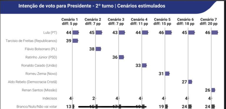 A primeira pesquisa Quaest do ano indica que Lula vence em todos os cenários eleitorais testados, tanto no primeiro quanto no segundo turno, e evidencia que, neste momento, a força eleitoral dele supera o momentâneo cenário desfavorável político-administrativo apontado pelos indicadores de opinião sobre o governo.