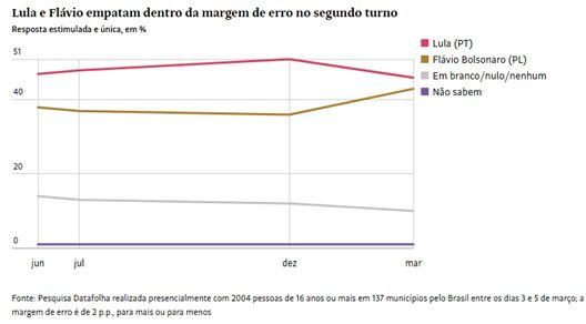 Em relação a dezembro, a vantagem de Lula sobre Flávio caiu 12 pontos percentuais.