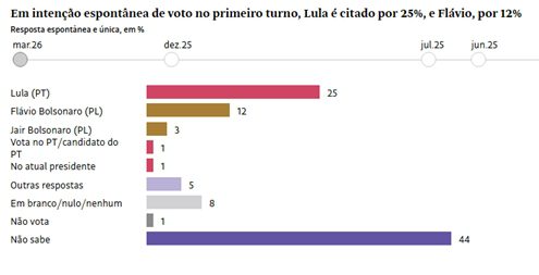 Na pesquisa espontânea, quando os nomes dos candidatos não são apresentados aos entrevistados, Lula aparece com o apoio de 25% dos eleitores e Flávio de 12%. Na última pesquisa, Lula tinha 24% e Flávio não era citado.