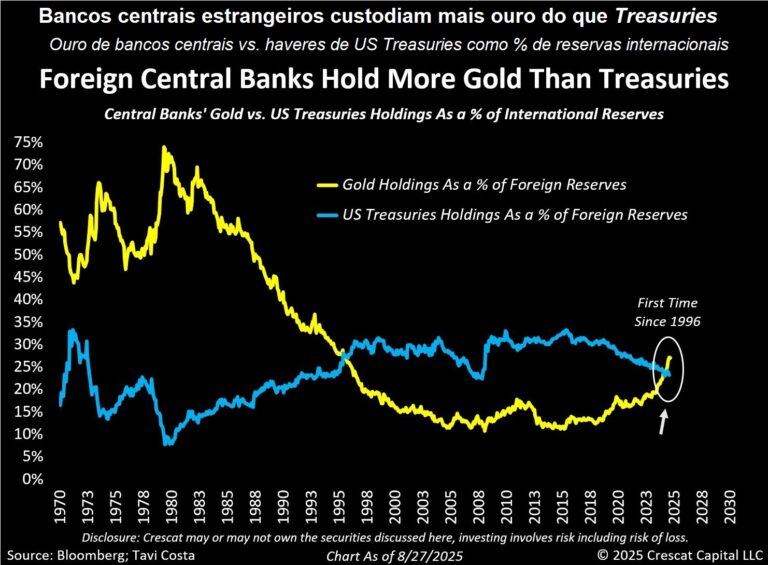 Há alguns dias, um conhecido analista de mercados, Octavio Costa, publicou um gráfico que mostrava que, pela primeira vez em 30 anos, o ouro havia superado os títulos do Tesouro dos Estados Unidos nos balanços dos bancos centrais.