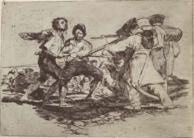 A série de gravuras de Goya, Los Desastres de la Guerra (“Os Desastres da Guerra”), criada entre 1810 e 1820, oferece uma expressão artística singularmente concentrada da cesura histórica da Guerra da Independência Espanhola. Muito mais do que uma mera representação dos eventos entre 1808 e 1814, a obra explora e corporifica o terror epocal que atingiu uma sociedade já abalada pelas tensões internas do Antigo Regime – conflitos sobre reformas, fragilidade econômica e polarização social. Neste contexto, a guerra surge como a culminação de uma crise prolongada, gerando continuamente novo horror, violência e morte. Numa sequência de gravuras pungentes, Goya traduz este momento histórico numa realidade física e psicológica concreta: os aspectos objetivamente terríveis da história fundem-se com a experiência subjetiva do terror. Assim, emerge uma nova linguagem visual, entrelaçando precisão documental com envolvimento existencial, arrastando os espectadores diretamente para a experiência de um mundo despedaçado.