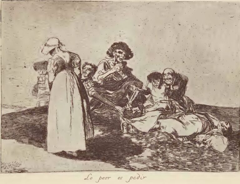 O título, “Lo peor es pedir” (“O pior é pedir”), aguça a amargura da cena. O pior não é a necessidade de implorar sem alívio, mas a erosão da dignidade, da solidariedade e da coesão nacional. Na sobreposição dos dois triângulos – um moribundo e terreno, o outro a afastar-se – Goya condensa o colapso da ordem social, tornando visível não só a morte por fome, mas a desintegração da própria comunidade.