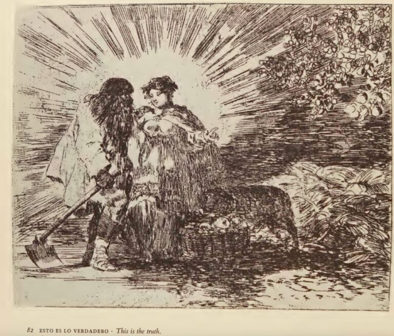 A Prancha 82, “Esto es lo verdadero” (“Isto é o verdadeiro”), forma a conclusão programática da série. Em contraste com as composições escuras e alegoricamente carregadas que a precedem, emerge uma cena de inesperada luminosidade. A Verdade ressuscitada aparece como uma figura terrena, quase camponesa, associada ao trabalho, à fertilidade e à abundância natural.