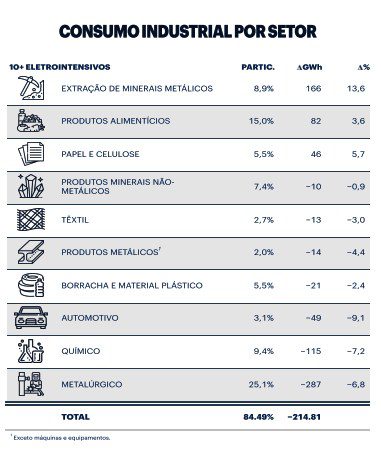 Entre os dez setores mais eletrointensivos, sete consumiram menos. A metalurgia (-6,8%; -287 GWh) foi o setor que mais contribuiu para a queda do consumo da indústria. Também reduziram o consumo de eletricidade os setores: automotivo (-9,1%; -49 GWh), produtos de metal (-4,4%; -14 GWh), têxteis (-3,0%; -13 GWh), produtos de borracha e matéria plástico (-2,4%; -21 GWh) e produtos de minerais não-metálicos (-0,9%; -10 GWh). Por outro lado, o consumo cresceu na extração de minerais metálicos (+13,6%; +166 GWh), em papel e celulose (+5,7%; +46 GWh) e na fabricação de produtos alimentícios (+3,6%; +82 GWh).