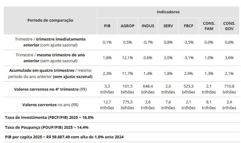 Em valores correntes, o PIB de 2025 alcançou R$ 12,7 trilhões e a taxa de investimento recuou de 16,9% em 2024 para 16,8% em 2025. Indústria de transformação caiu 0,2% e os juros frearam o consumo das famílias