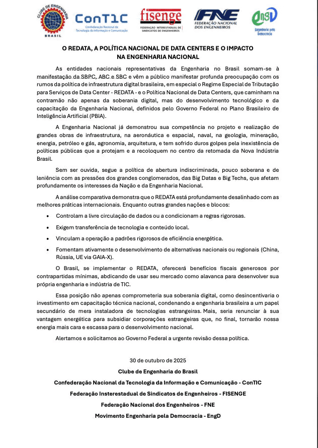 No texto, as organizações afirmam que o REDATA e a Política Nacional de Data Centers “caminham na contramão não apenas da soberania digital, mas do desenvolvimento tecnológico e da capacitação da Engenharia Nacional”.