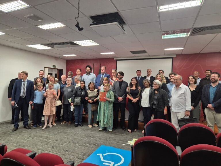 Na foto, com os presentes ao ato na FESPSP, a professora Liudmila segura o livro O Barão do Rio Branco e Caricatura: